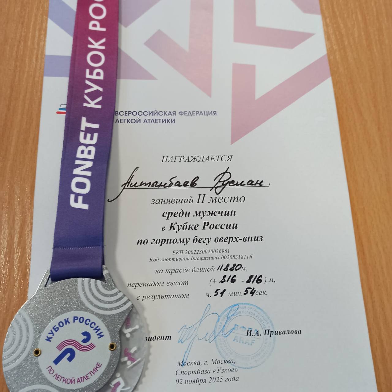 В этом году он стал чемпионом России по горному бегу, а выступая в прошедшие выходные в Москве на Кубке России по горному бегу занял 2 место.